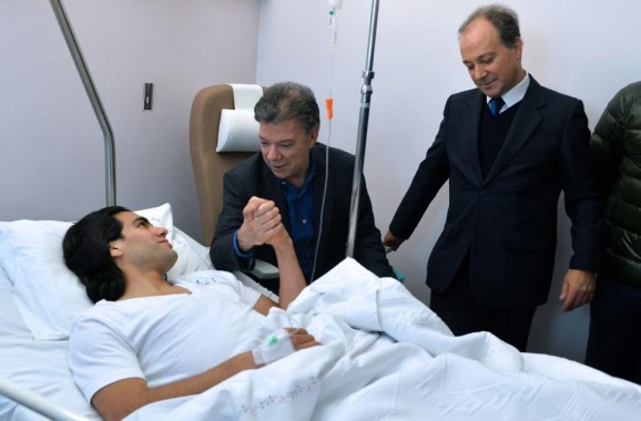 President Santos bracht el tigre een bezoek na diens geslaagde knieoperatie in het Trindade Hospital in Porto, Portugal. Het ging er gezellig aan toe in de Fero zetel, waar Santos en Falcao keuvelden over Falcao’s kansen op deelname aan het WK in Brazilië deze zomer.